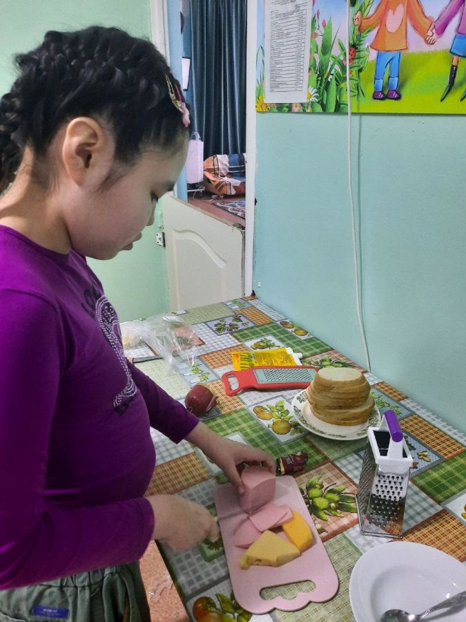 Карина вчера готовила бутерброды вместе с воспитателем.