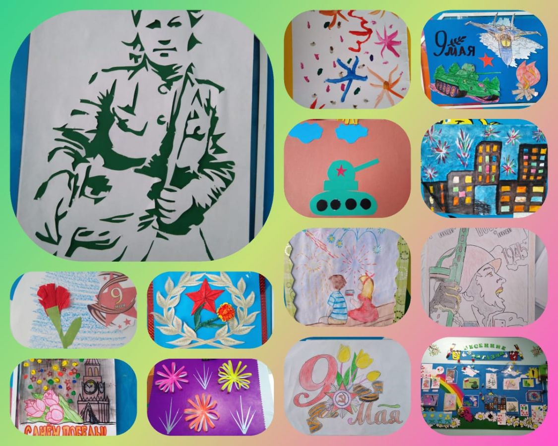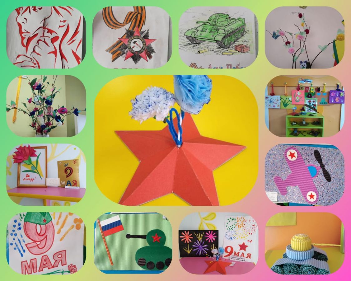 Педагоги оформили тематическую выставку творческих работ, посвященную Дню Победы. Изготовили атрибуты для праздничного парада. Воспитанники старших групп читали стихи о подвигах солдат, пели военные песни, смотрели презентации на военную тематику и хронику военных лет; беседовали о войне; слушали музыку военных лет, рассматривали иллюстрации посвященные ВОВ и Дню Победы. Занимались продуктивной деятельностью: рисовали рисунки про войну, лепили военную технику, делали с помощью аппликации красные гвоздики и георгиевские ленточки.